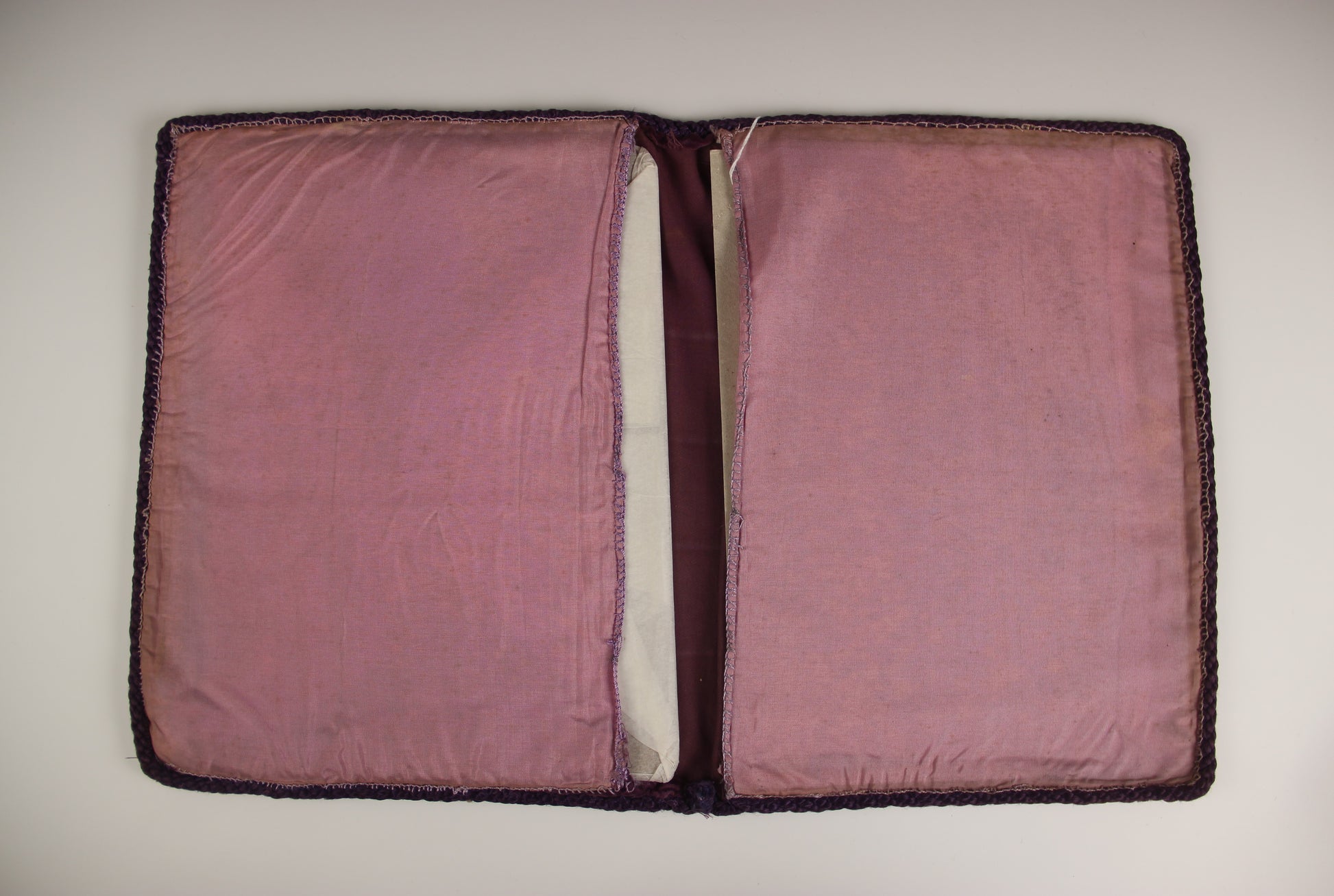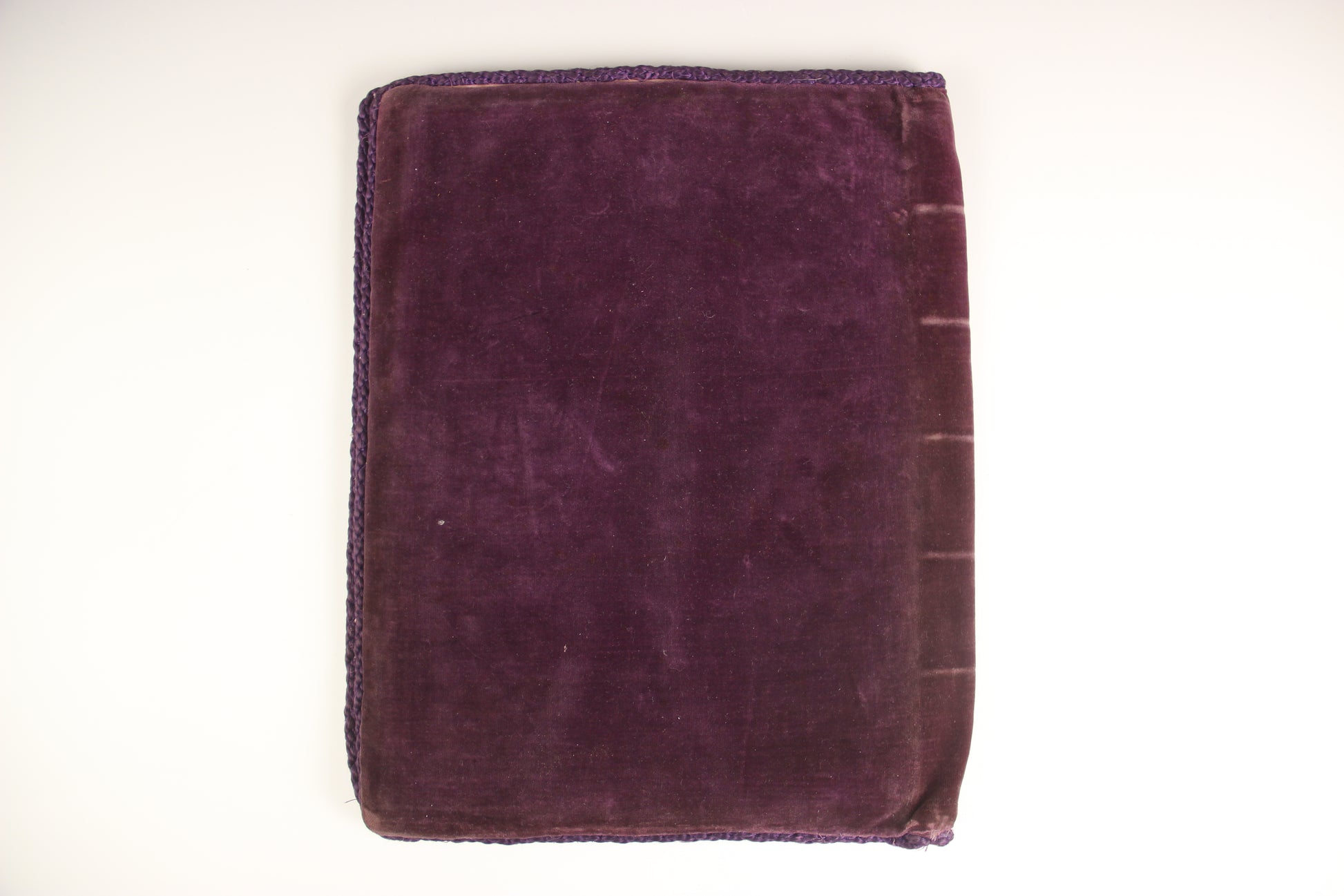 In polychrome and gilt threads mounted upon purple velvet, edged with rope detail, to cover 12.5 x 9.75 inches (at fault).