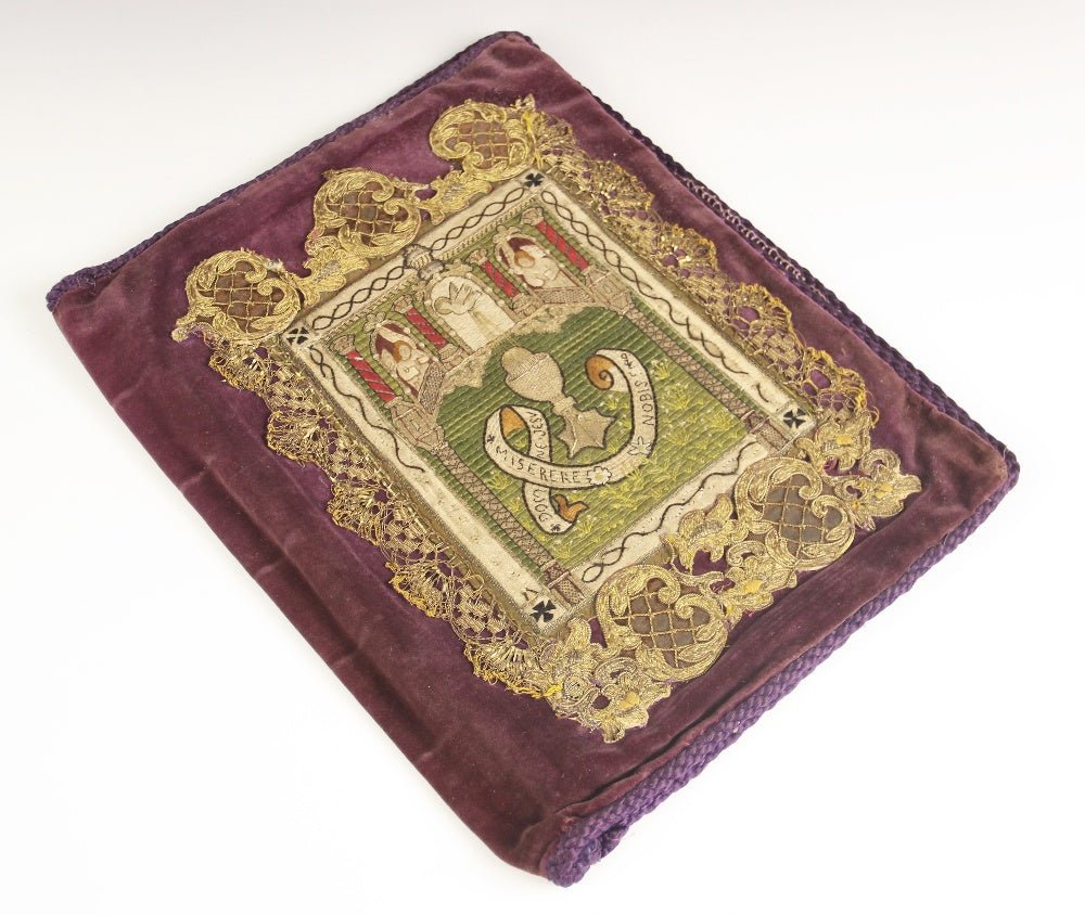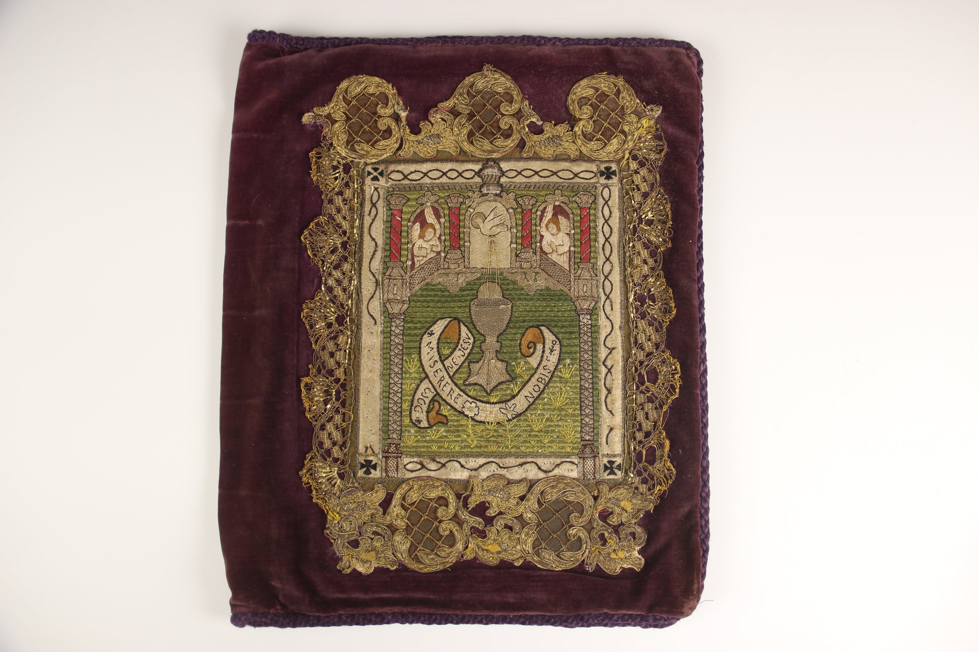 An embroidered and applique bible cover, 18th century and later, depicting the sacrament beneath angels and a dove, with scrolling religious verse 'domne jesu miserere nobis', (Lord Jesus have mercy on us) Normal anitque aging and some loss in the embroidery. The applique is older than the velvet cover (19th century)