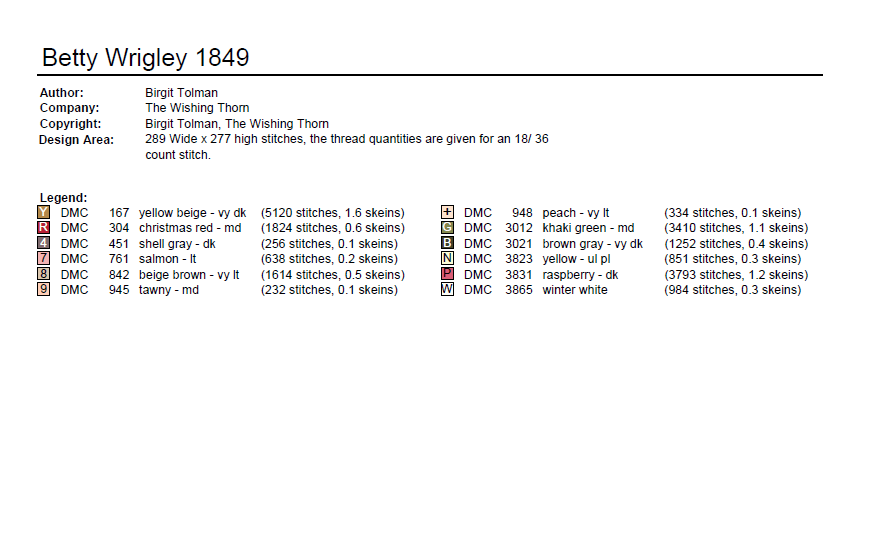 The design area is 289 stitches wide by 277 stitches high and is charted in DMC. The model is on 40 count Affogato using DMC threads. Check the supplies image as some colors require more than one skein.