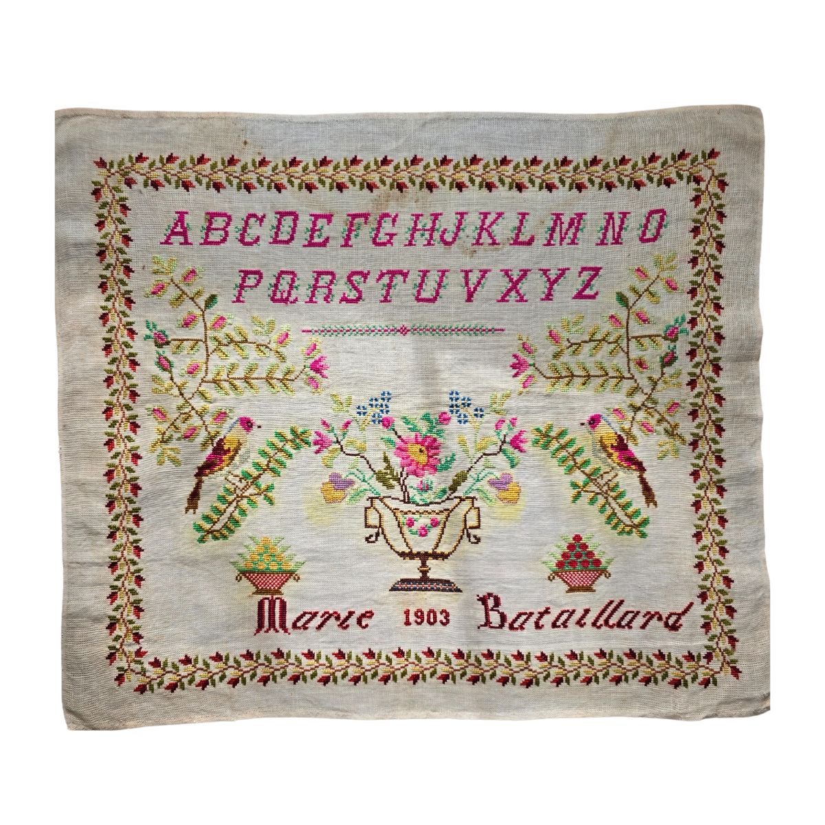 Gorgeous 1903 French sampler with colorful birds and flowers. Signed by Marie Bataillard. Unframed with some discoloration, as seen in the images. In very good antique condition.
