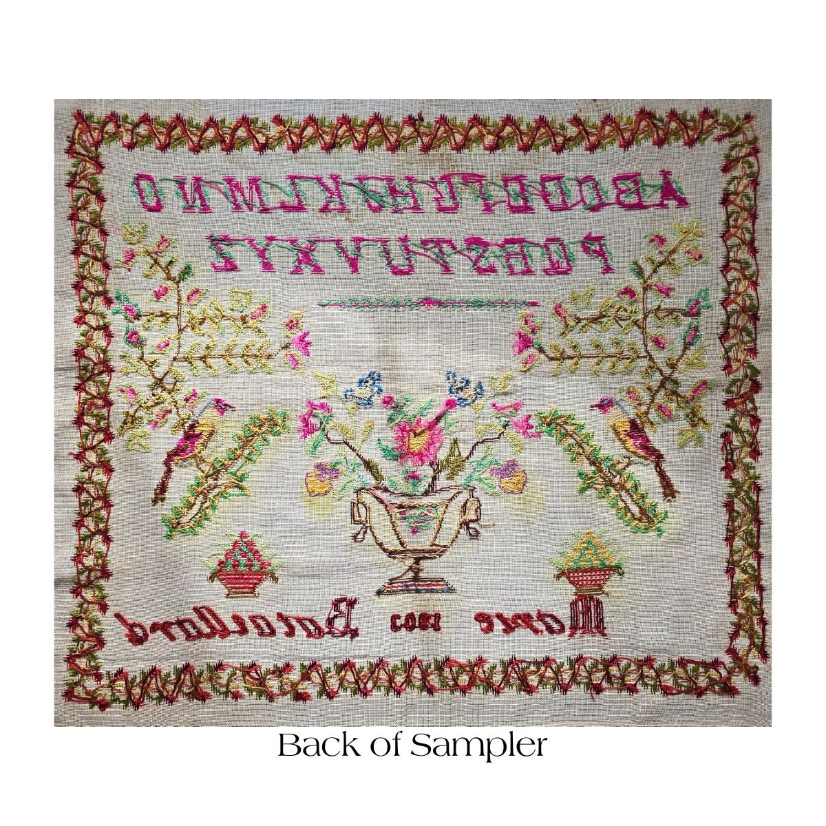 Embroidered silk on linen. The sampler measures 21 by 18 inches. The edges are hemmed.