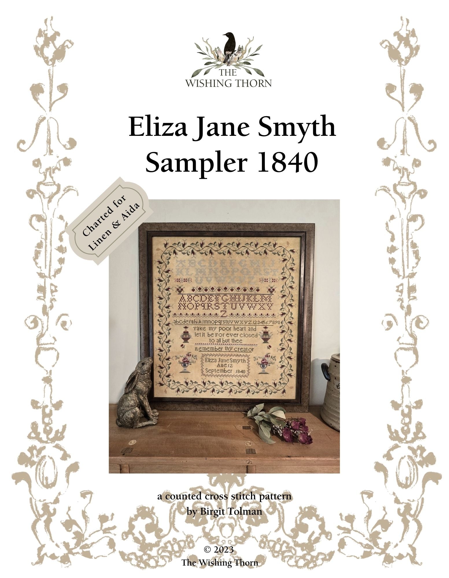 Eliza Jane was only 12 years old when she created such an elegant sampler with the most unusual rose border. Eliza Jane is from Ireland, and not much is known about her life. She most likely attended Mrs. Leathem's School in Londonderry (called Derry) - a very similar sampler exists stitched by Frances Jane Hill. Jane stitched this at a time when the Poor Law was instated and right before the Great Hunger in 1845, almost 1 million lives were lost to famine. During this period almost 1.5 million Irish sailed for America.