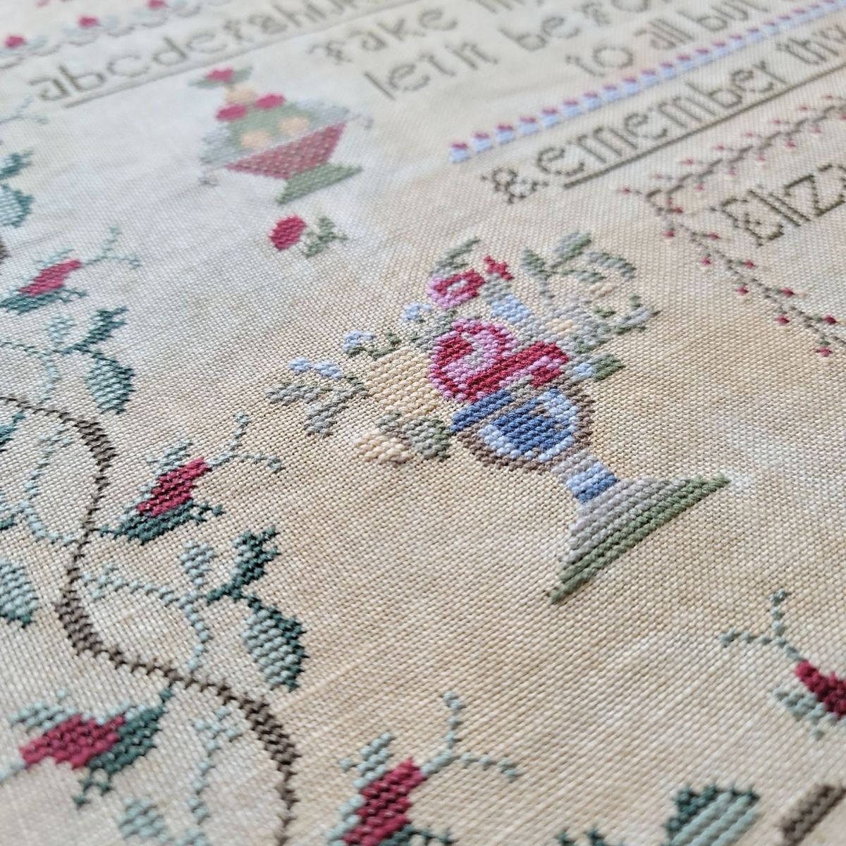 Eliza Jane was only 12 years old when she created such an elegant sampler with the most unusual rose border. Eliza Jane is from Ireland, and not much is known about her life. She most likely attended Mrs. Leathem's School in Londonderry (called Derry) - a very similar sampler exists stitched by Frances Jane Hill. Jane stitched this at a time when the Poor Law was instated and right before the Great Hunger in 1845, almost 1 million lives were lost to famine. During this period almost 1.5 million Irish sailed for America.