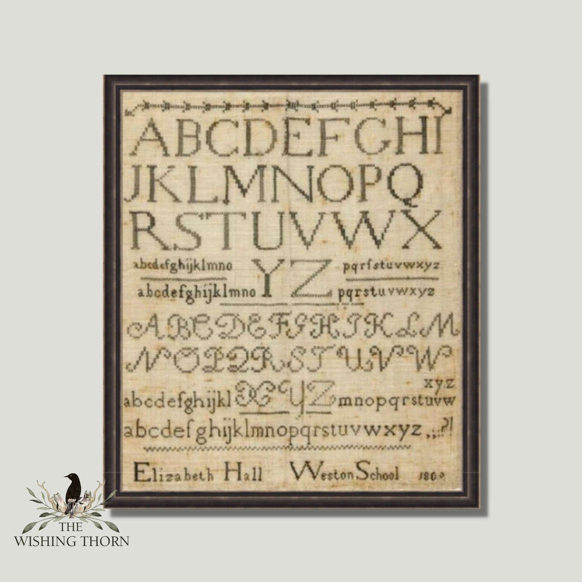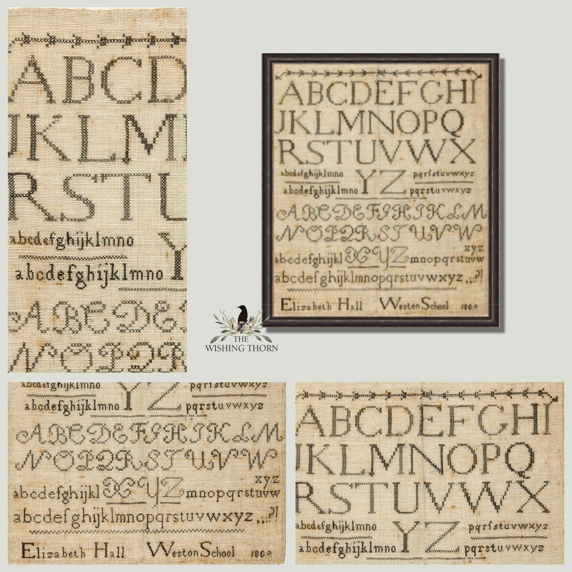 The original sampler was stitched with cotton thread on linen cloth and measured 12.75" H by 10.75" W.
