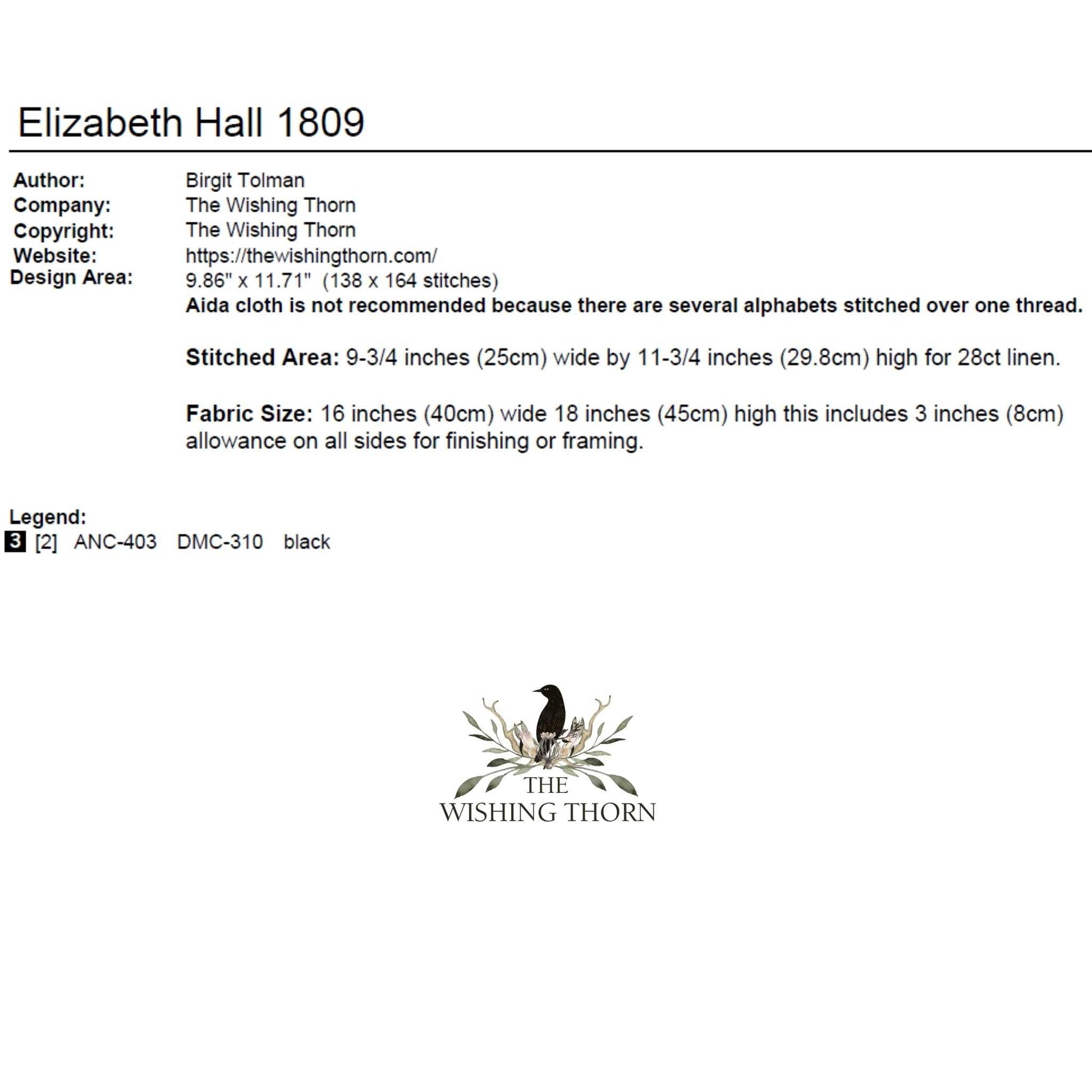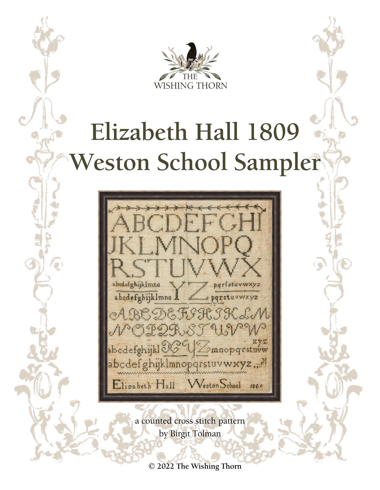 The original sampler was stitched with cotton thread on linen cloth and measured 12.75" H by 10.75" W.