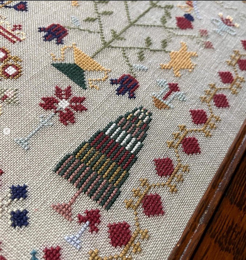 The Model uses Ginnie Thompson Flower Threads and 36 count Tin Roof by Weeks Dye Works. The pattern is also charted DMC Threads for those that rather not use GTFT. A limited amount of thread packs are available in the kits section of the store.