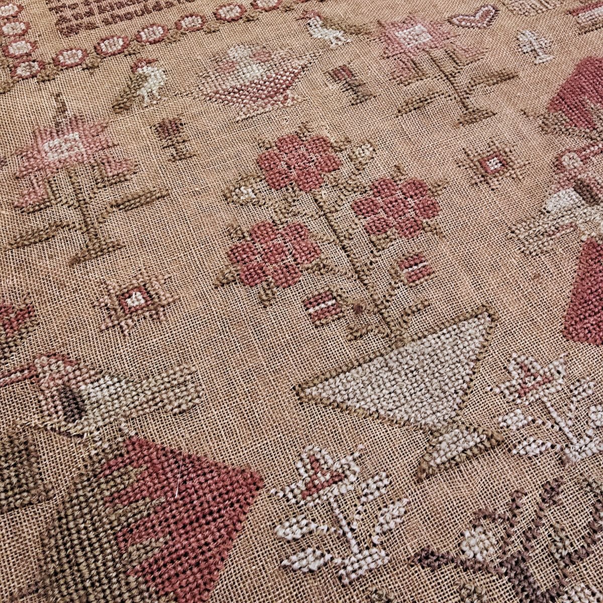 Discover the gentle charm and symbolic beauty of the Emma Matthews Sampler, worked in 1855, a stunning example of mid-19th-century needlework. Emma’s piece is filled with classic motifs that speak to the values and aesthetics of her era, lush floral motifs so indicative of Welsh samplers. Two graceful deer, birds perched among everywhere, and an traditional Adam & Eve scene at the base, all framed by a charming border.