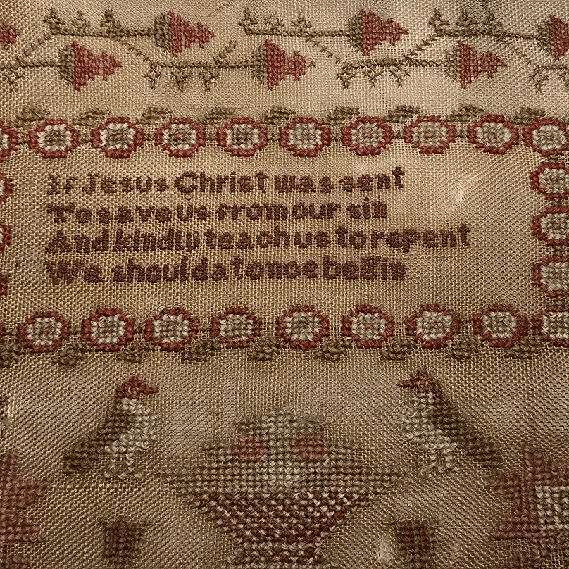 At the top, Emma stitched a heartfelt verse in a pretty floral cartouche, capturing both her faith and the sentimentality so common in samplers of this period. Her original work displays a sophisticated balance of symmetry and whimsy, offering today’s stitchers a design rich in history and stitching pleasure.