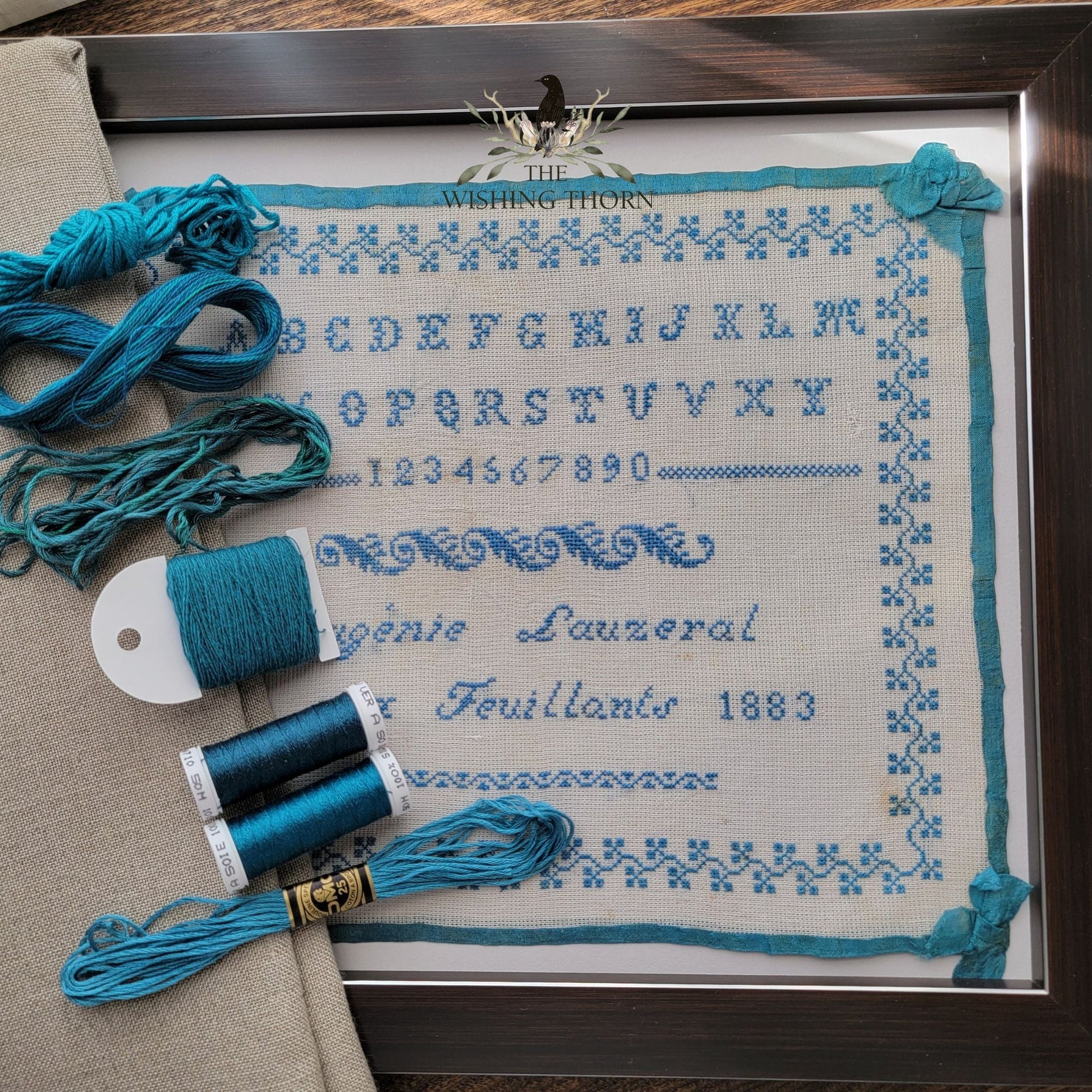 The exact thread color match is a mix between DMC 518 & 3810, but there are many other lovely contenders. I will list them on the back of the chart. This could also easily be stitched in a true blue or red. So many options with this sweet marking sampler.
