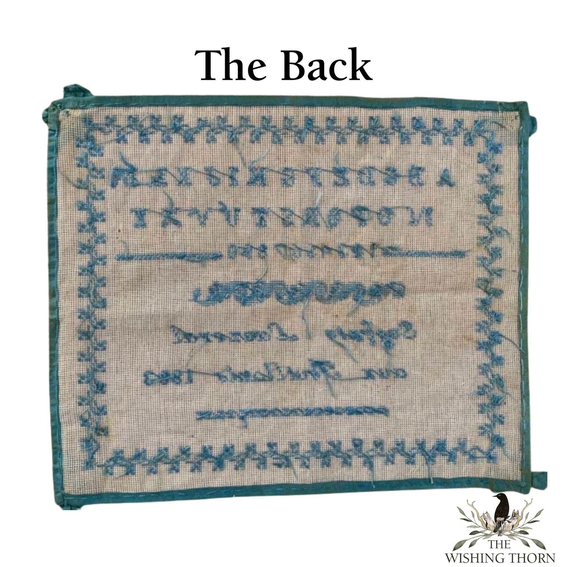 Eugenie hails from the southern coast of France. Her charming sampler reflects the color of the Mediterranean ocean and she also incorporates the water with her lovely wave pattern. Finished off with a satin ribbon and bows in the corners. Nothing could be more adorable.