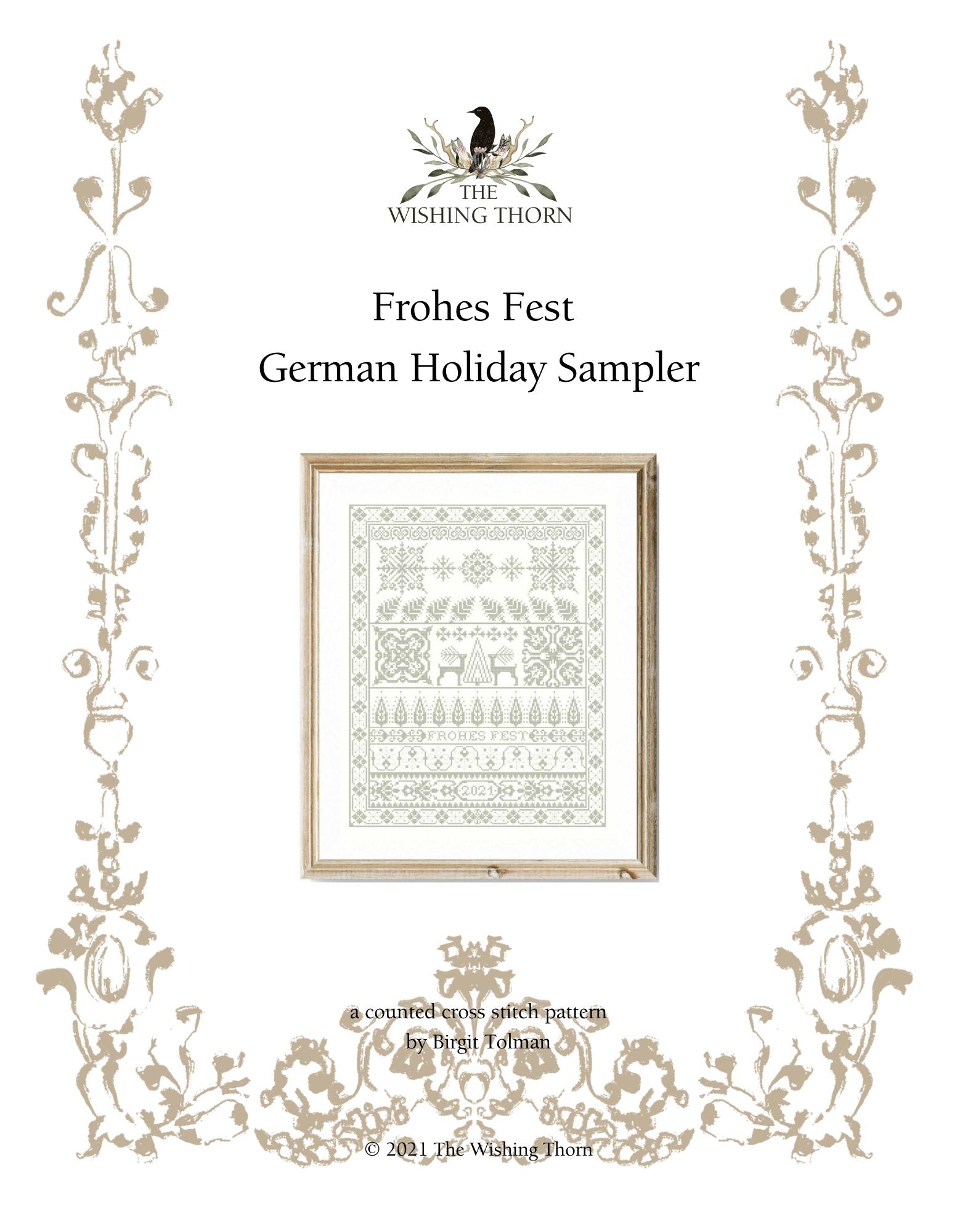 An intricate German Holiday Sampler. This pattern is designed to be stitched on white 18ct Aida or 36ct white linen. This will make the finished project a bit more manageable in size. Frohes Fest means Happy Holidays in German.
