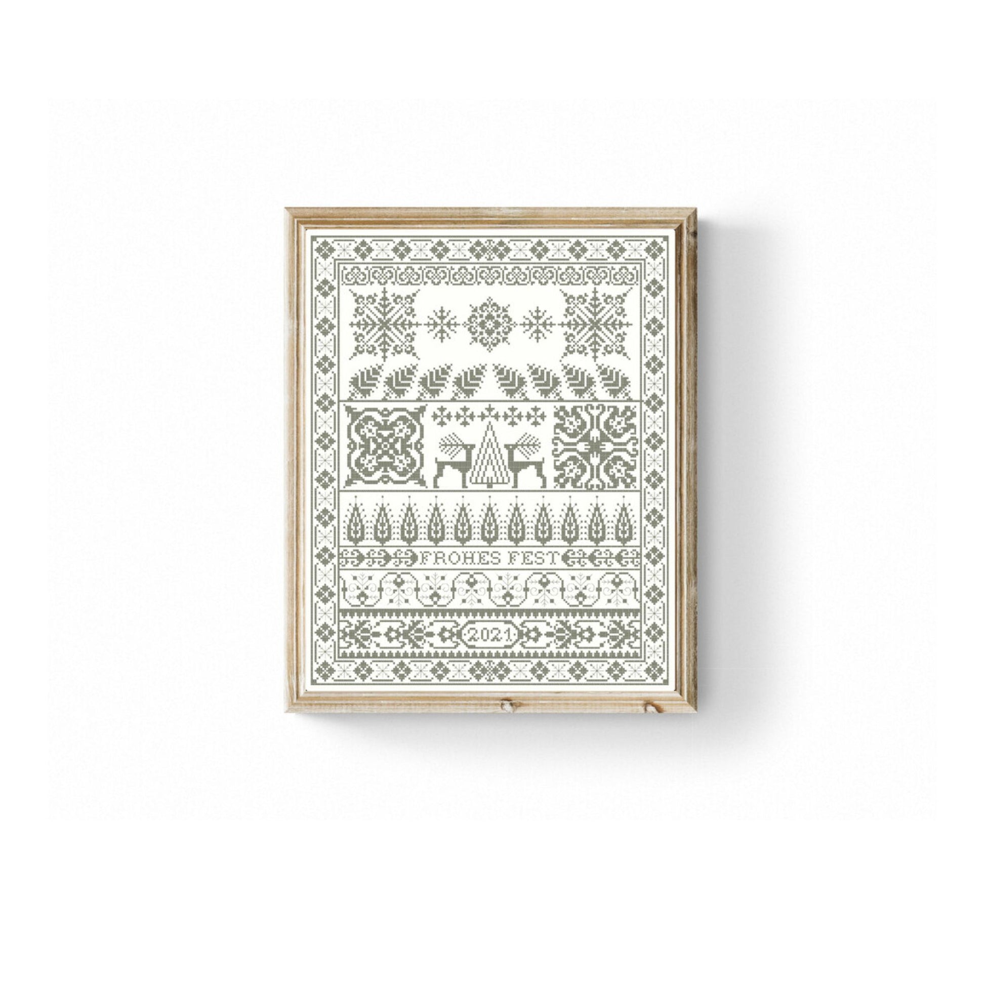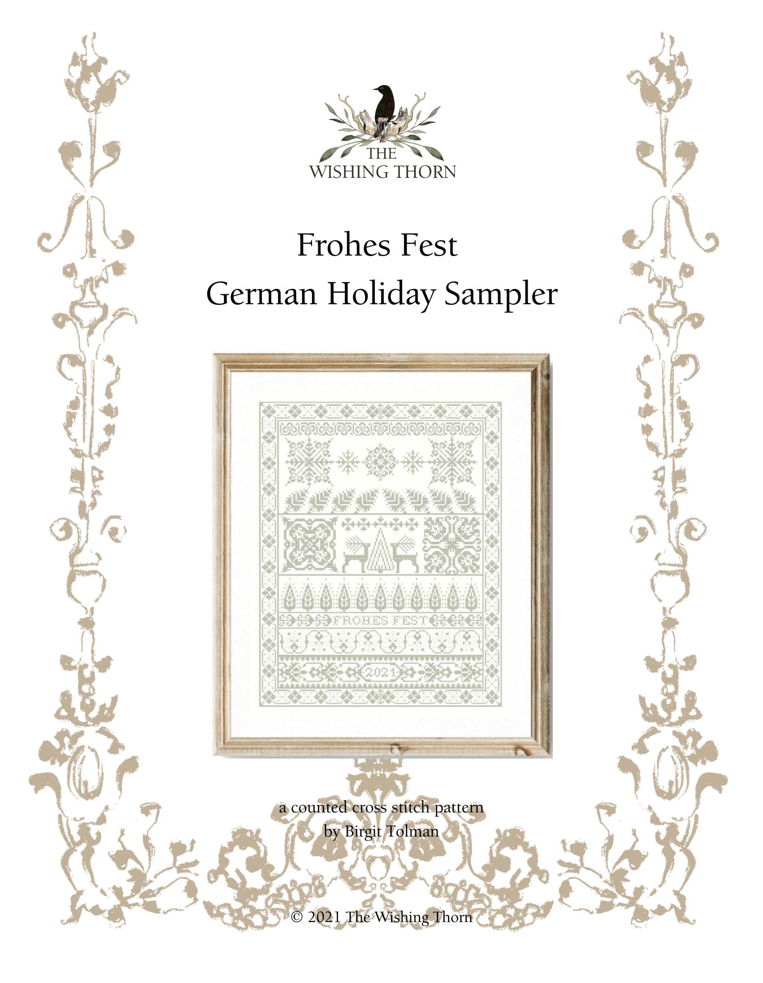 An intricate German Holiday Sampler. This pattern is designed to be stitched on white 18ct Aida or 36ct white linen. This will make the finished project a bit more manageable in size. Frohes Fest means Happy Holidays in German.