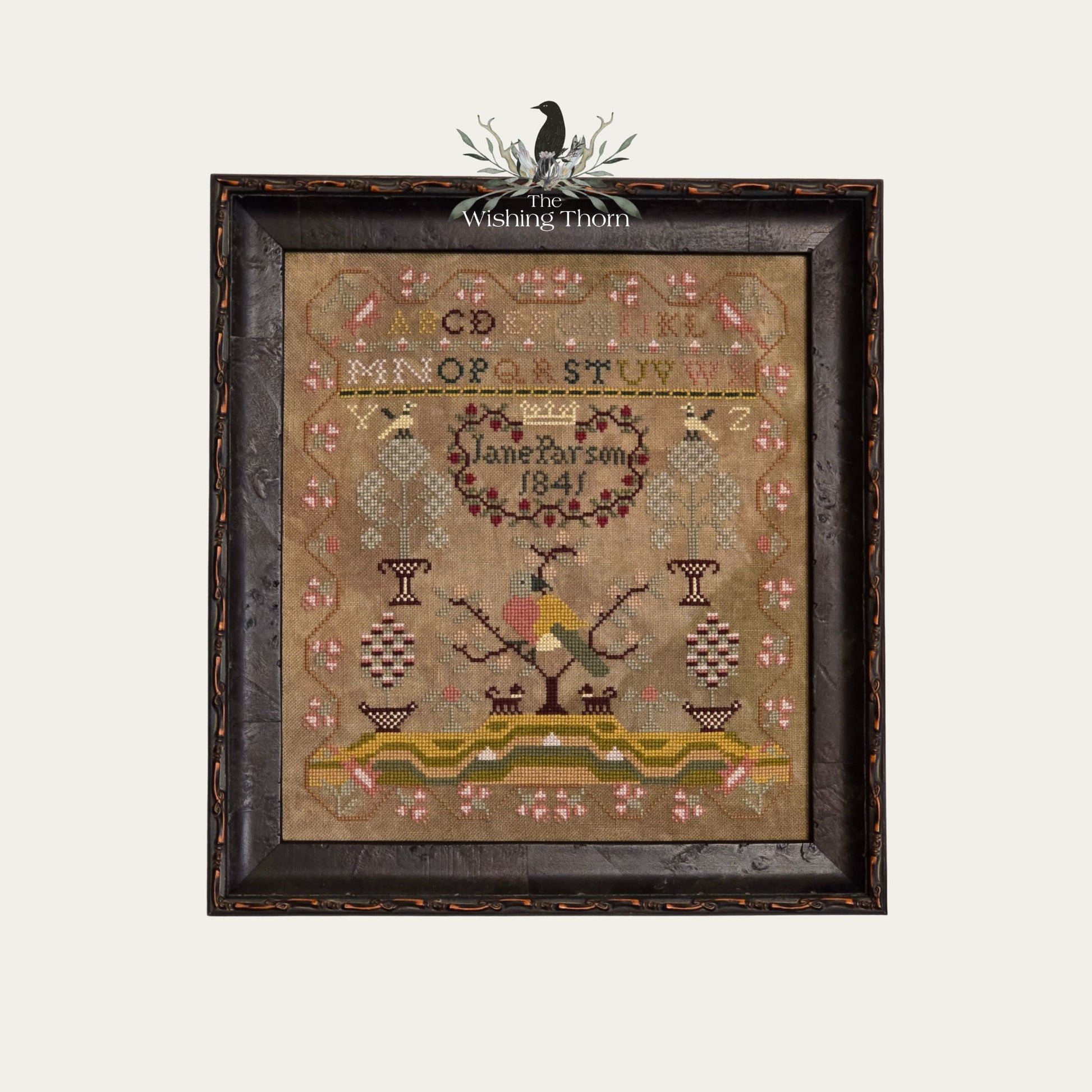 The flower threads allows you to stitch on a slightly higher count than the wool and it is great (and cheaper) alternative to the wool. Shown here, the framed Jane Parson on 36 count Dulce De Leche by FOAW. The other fabric sample is 18 count Wheat by FOAW.