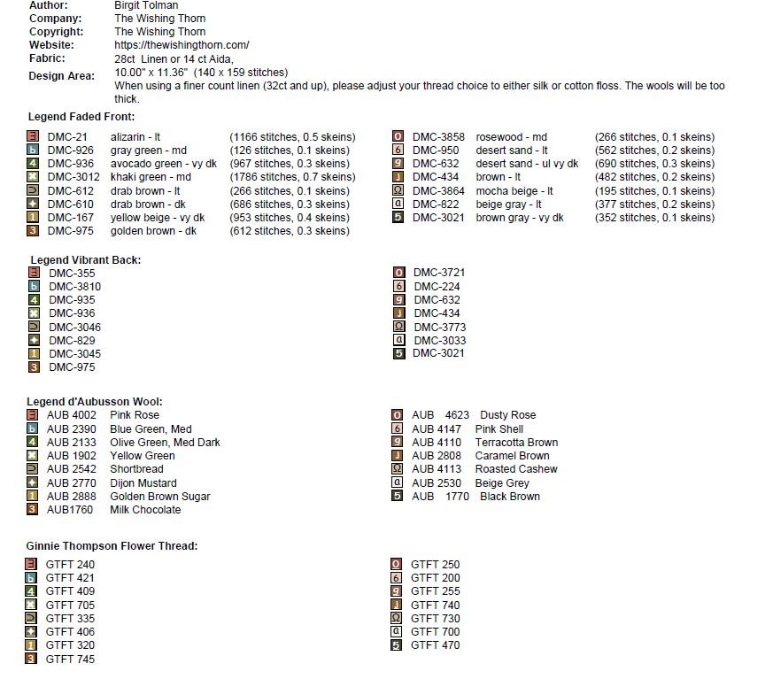 Floss choices are two DMC versions, the front of the sampler and the none faded back of the sampler. Additionally, I am including the colors for Au ver a soie Fine d'Aubusson Wool as the original was stitched in wool on roughly 30ct linen with the original size being 9.25 x 10.5 On 28ct the finished piece will be 10 x 11.5. If you are using wool, I would not go smaller than 28ct otherwise the wool will be too thick, especially if you are planning on stitching over one. It might be doable in 32ct if you choose to stitch the over-one section as a half-cross stitch.