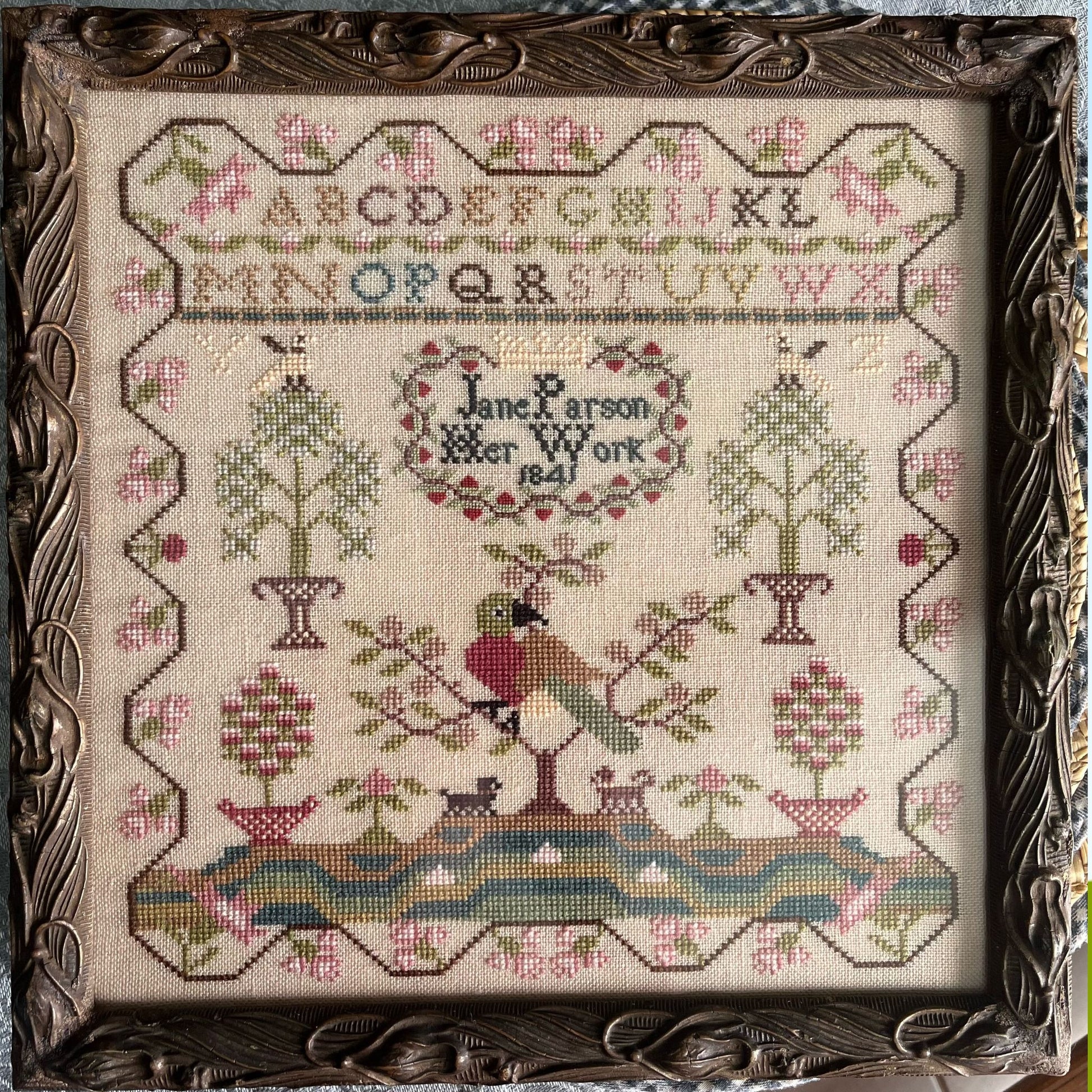 I found the Jane Parson Sampler in an antique shop in Massachusetts, only about two hours from where Jane was born in Hinsdale MA in June of 1823. Her being somewhat older (18) when she stitched this sampler explains the exactness of it. The border, the spaces between stitches, and the symmetry and composition were executed so well. Many sampler stitchers had difficulties aligning their border perfectly and symmetrically, Jane had mastered this.