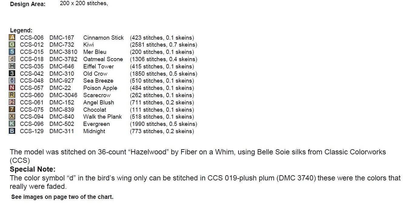 ***The color symbol “d” Oatmeal Scone, in the bird’s wing only can be stitched in Belle Soie silk Plush Plum CCS 019 (DMC 3740) or in some charts that have the Plum color “P”, it can be changed to CCS 018 Oatmeal scone (DMC 3782). It is a personal choice if you want the front or back color.