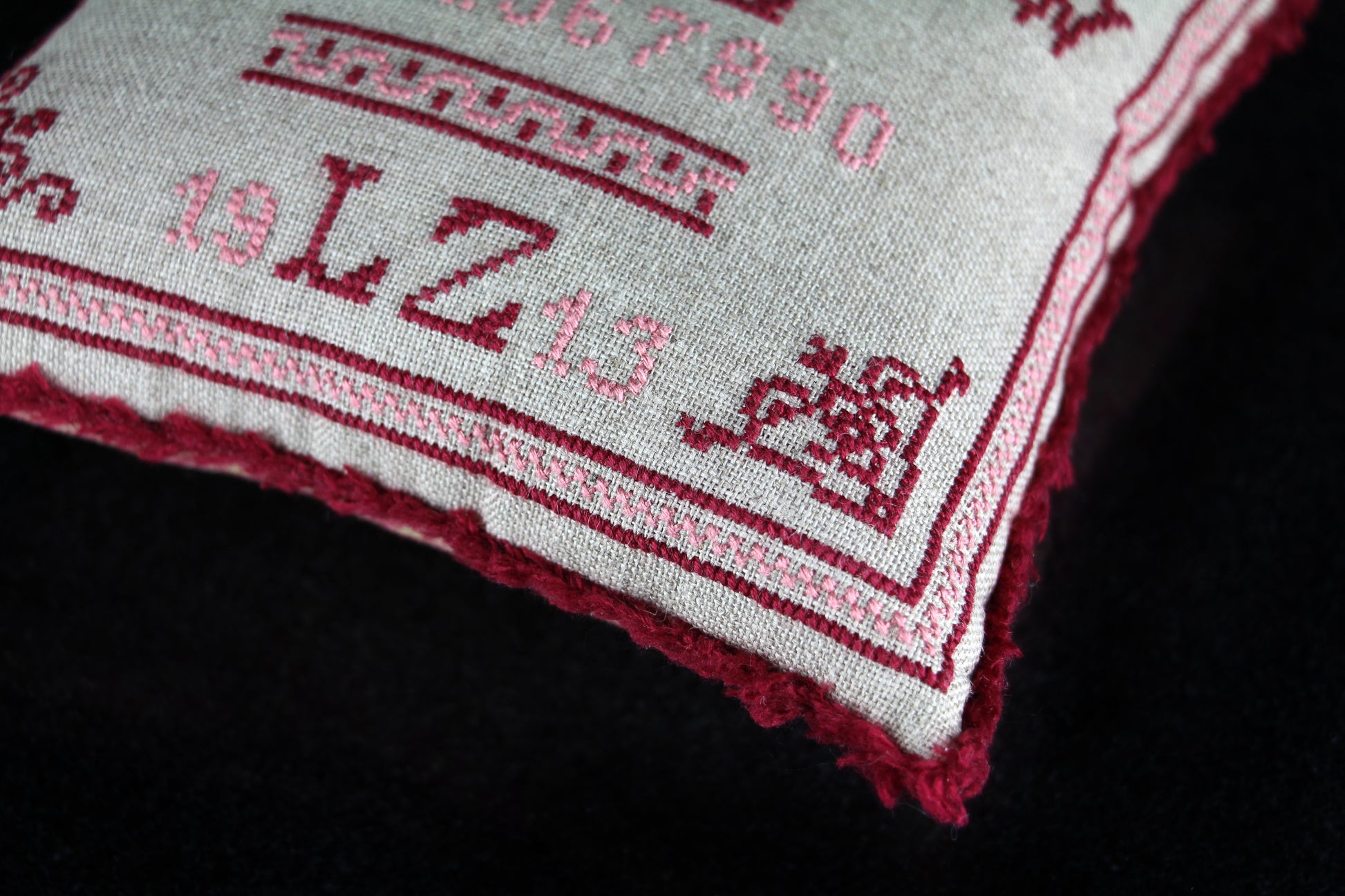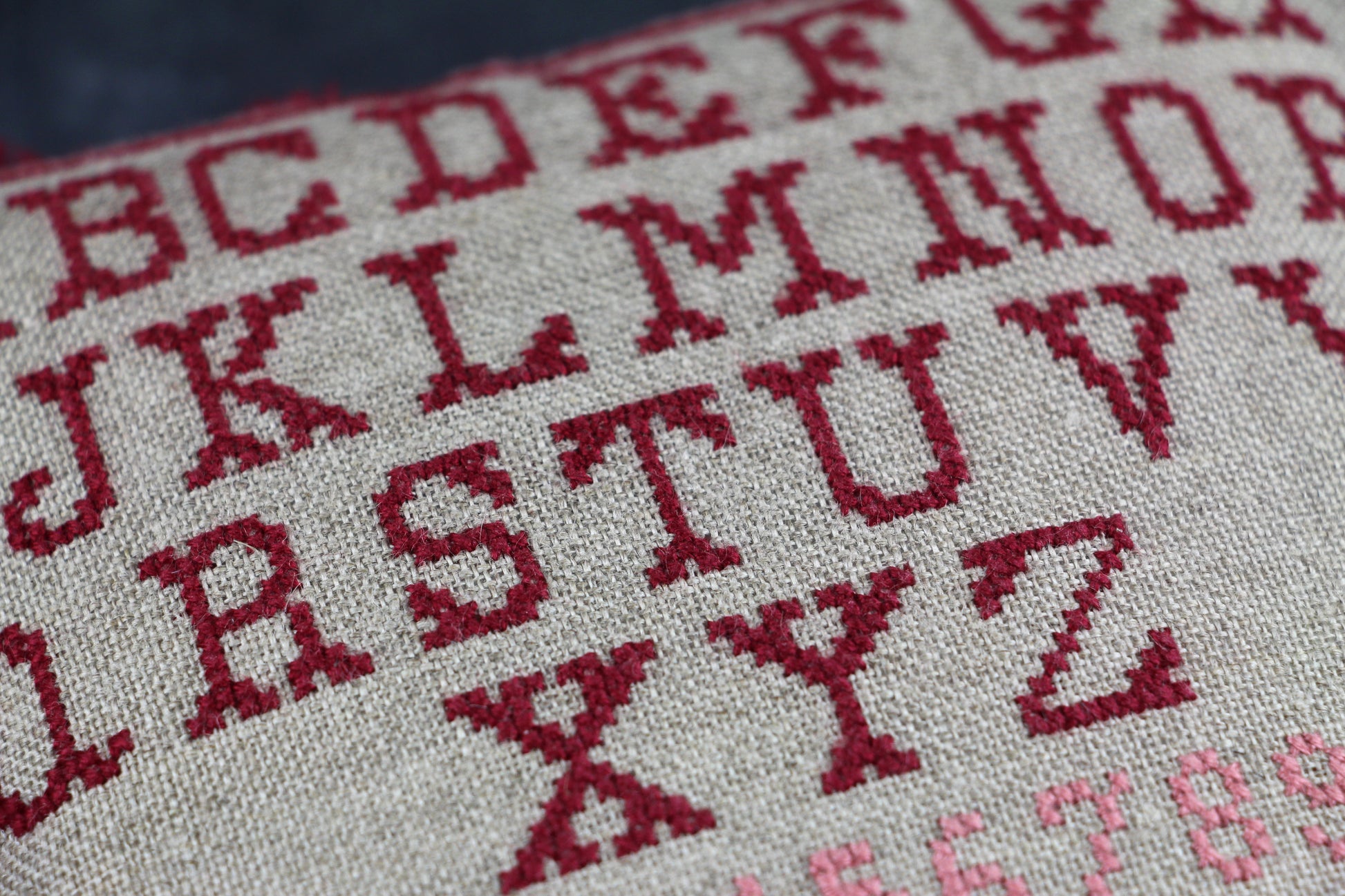 This sampler hails from the Netherlands, a more unusual version from this time period. The original is quite large and stitched on a large count of even-weave cotton fabric. There are some definite art deco influences noticeable. It is very fortunate that the paper ribbon border survived with this sampler. I am so grateful.