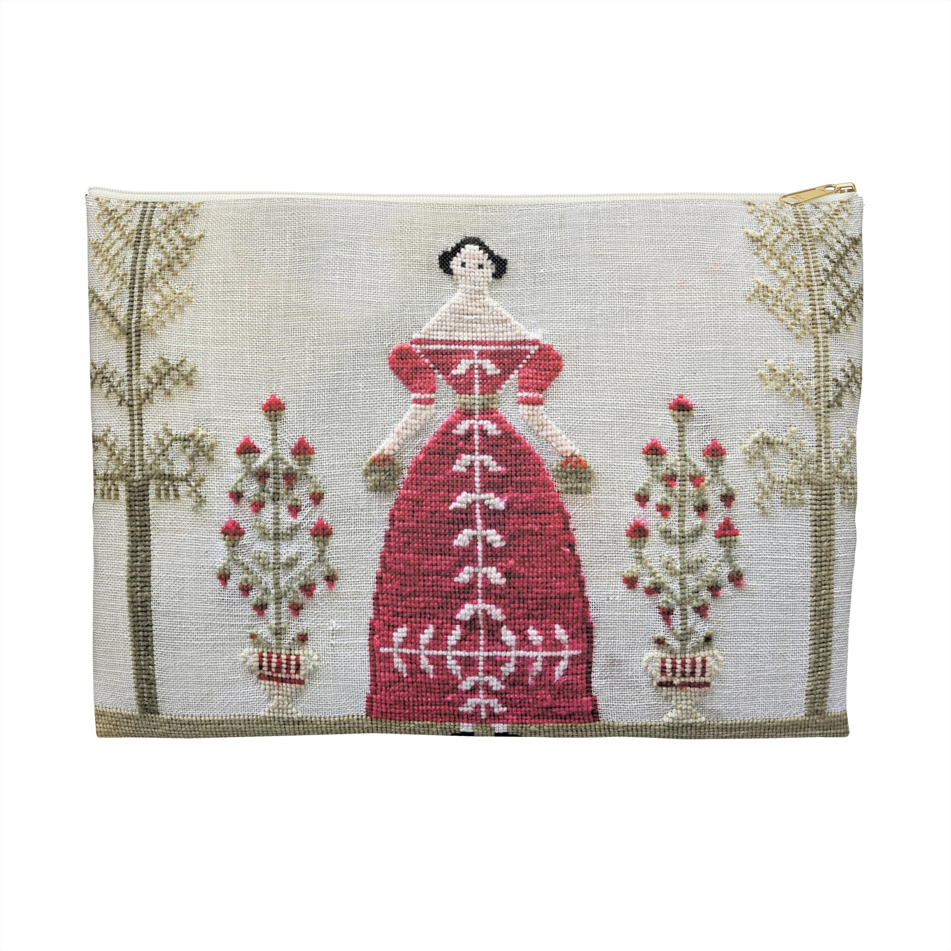 A practical storage bag fits the need for almost all your needlework storage. It measures 12 x 8.5 inches. Large enough to hold a chart, hoop fabric, and floss. It is fantastic to bring along on vacation or any trip.