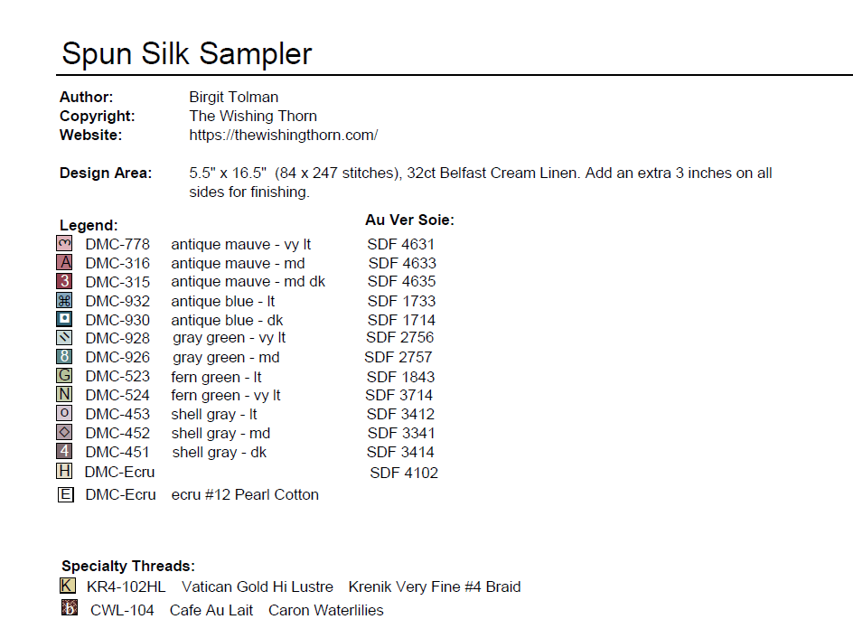 Spun silk is a delicate band sampler that teaches a variety of stitches. It is a great size on 32 count linen and doesn't overwhelm if you are new to specialty stitches. There are over 20 different bands with different stitches and techniques. The sampler is a comfortable size to stitch and it is charted in Silk/ DMC along with some specialty threads.