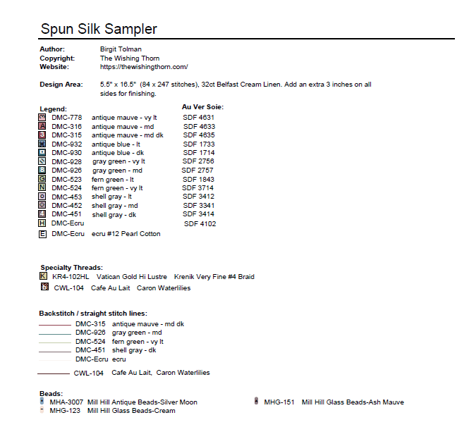 Spun silk is a delicate band sampler that teaches a variety of stitches. It is a great size on 32 count linen and doesn't overwhelm if you are new to specialty stitches. There are over 20 different bands with different stitches and techniques. The sampler is a comfortable size to stitch and it is charted in Silk/ DMC along with some specialty threads.