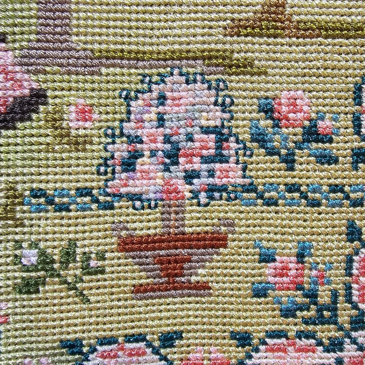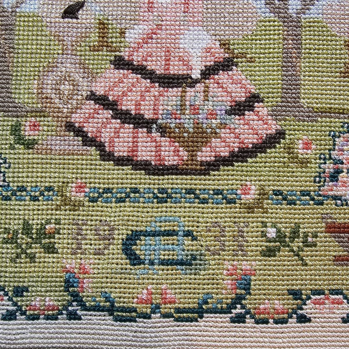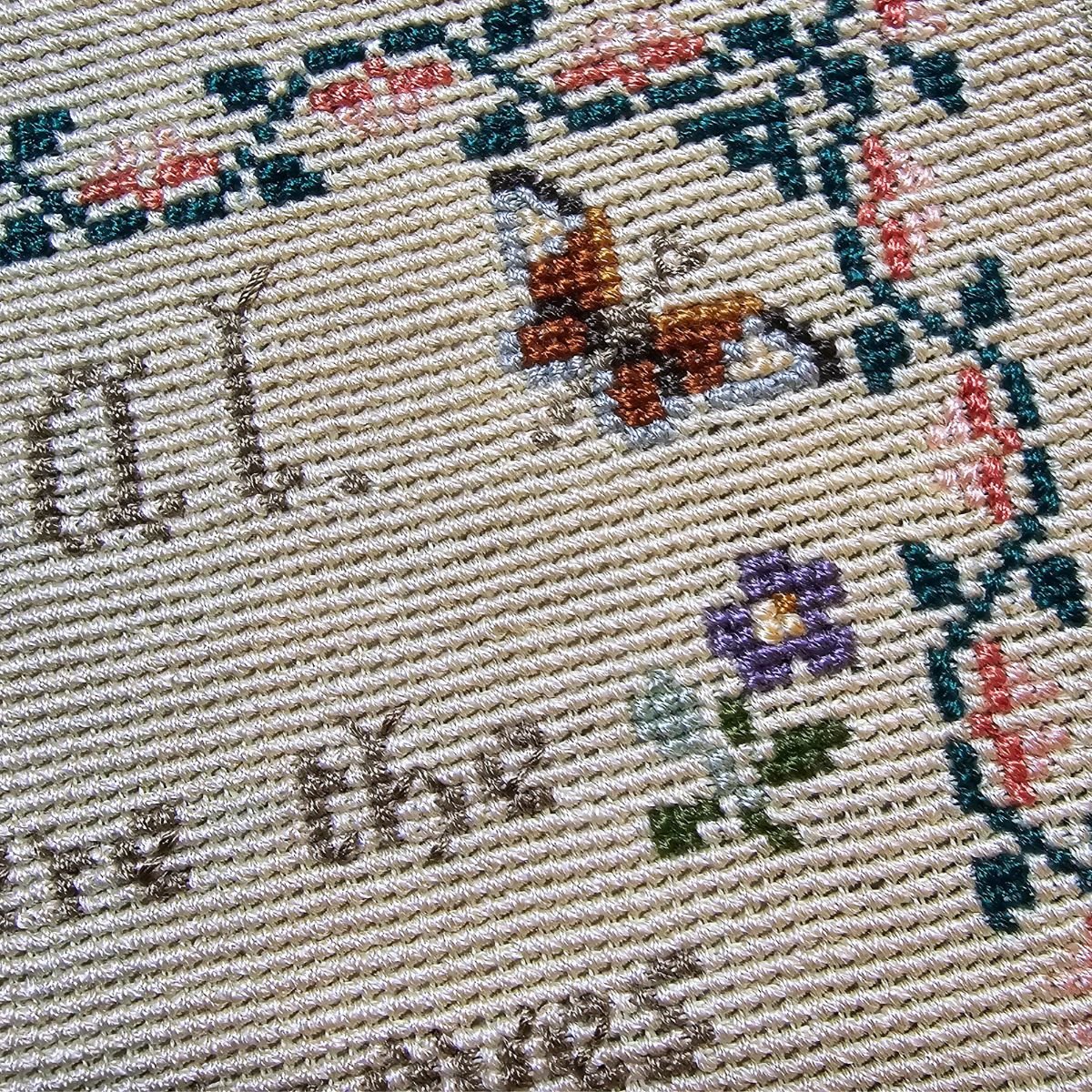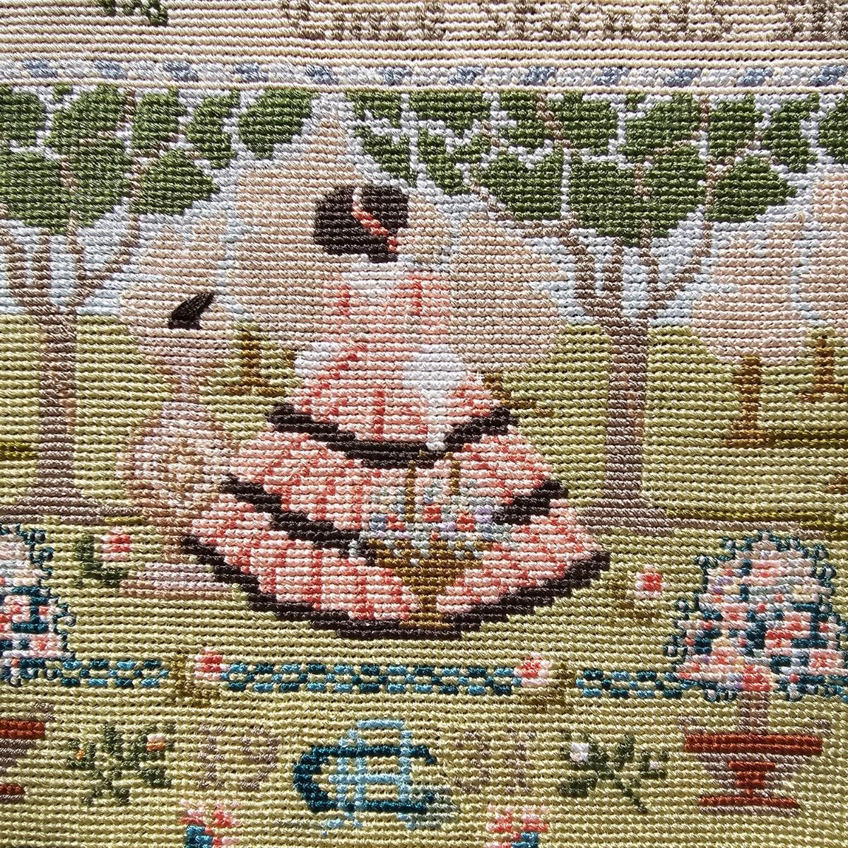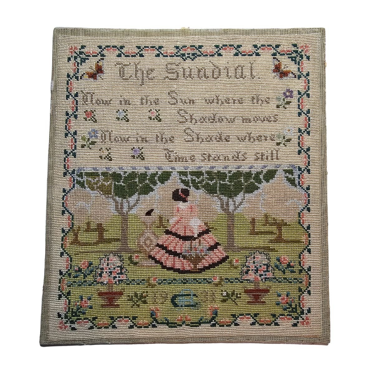 A beautiful full coverage English Sampler by AC 1931. The scene is just charming with the girl and her flower basket walking in a lovely garden and looking at the sundial. All surrounded by a traditional floral border with butterflies in the corners. The stitcher did a wonderful job creating depth in her garden scene.