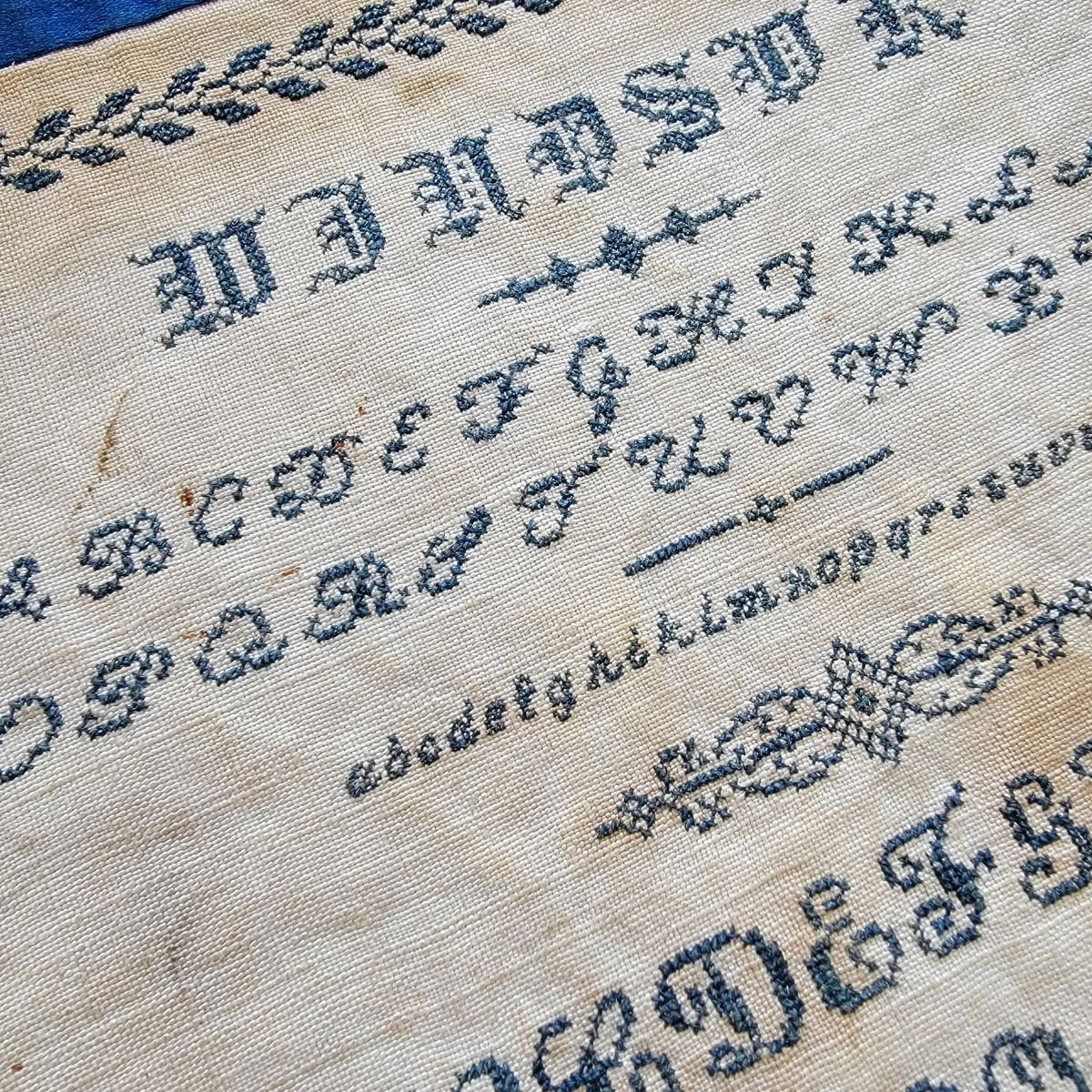 This charming sampler is a lovely example of the fine artistry of hand stitching. The sampler is made up of various blue alphabets, with good composition and design. The original was stitched on a tiny count 70/68ct. This is a great project to work on for your blue sampler collection or if you need something new to add to your stash.